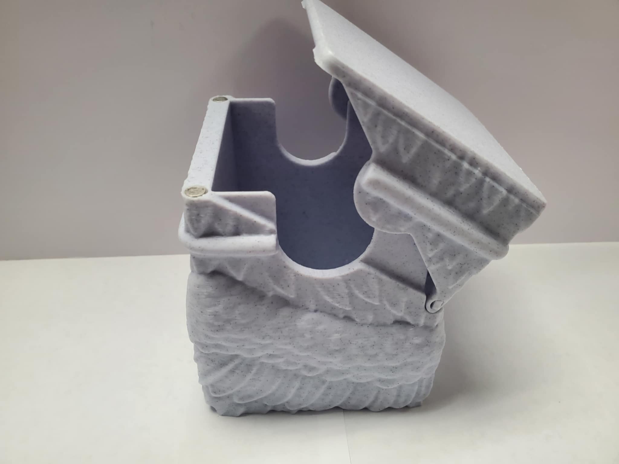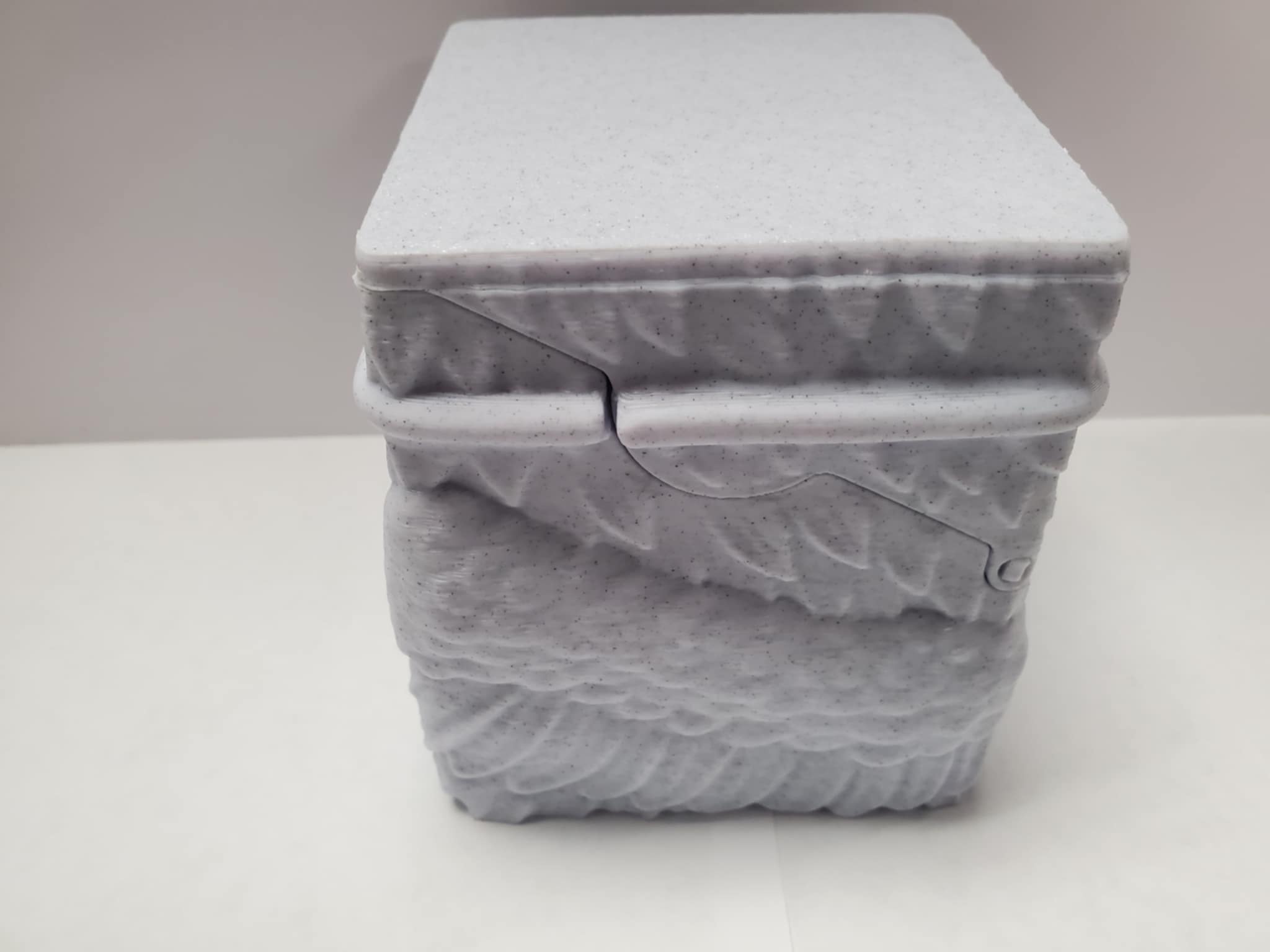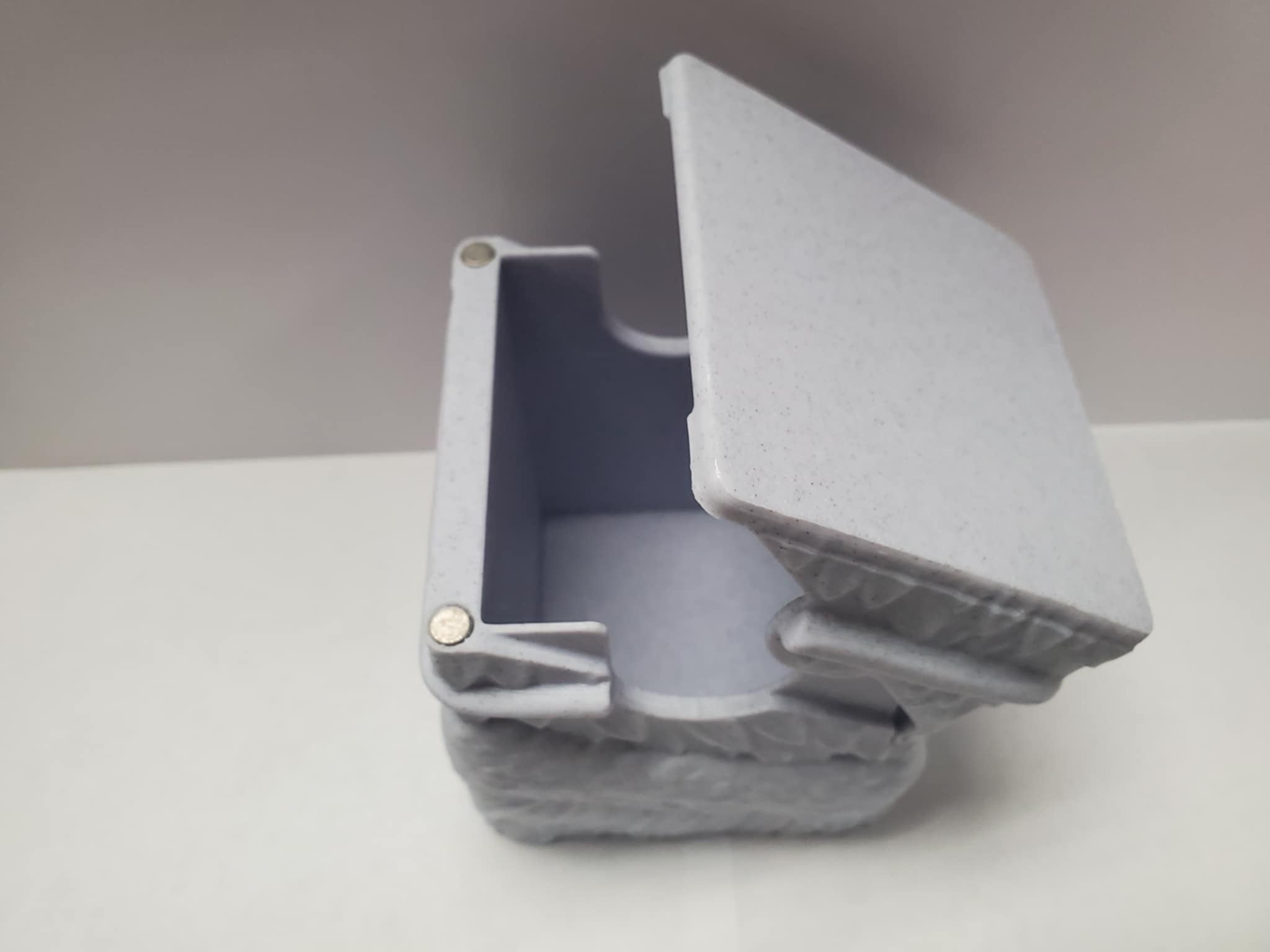 A solid 3D printed Deck box with a pull back lid and solid magnetic latch when closed.